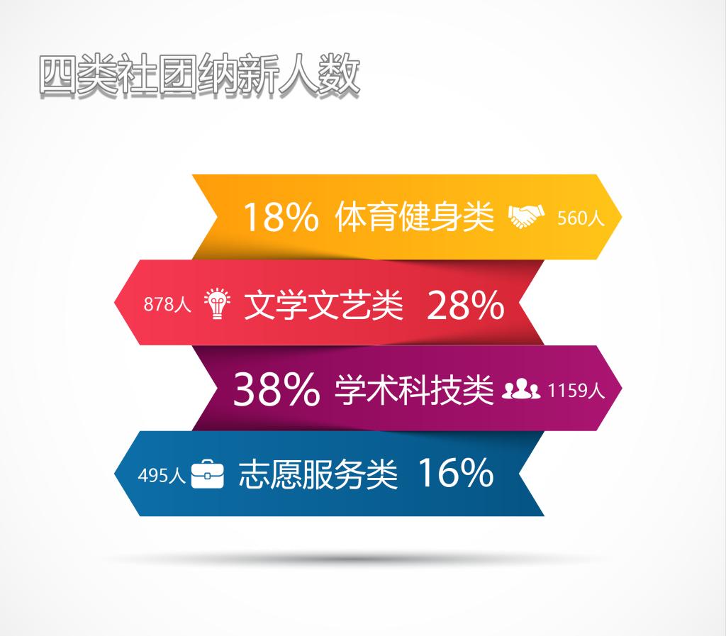 新生对学术科技类社团最感兴趣,有1159人报名加入,占纳新总数的38%;其次是文学文艺类社团,有878人报名加入,占纳新总数的28%