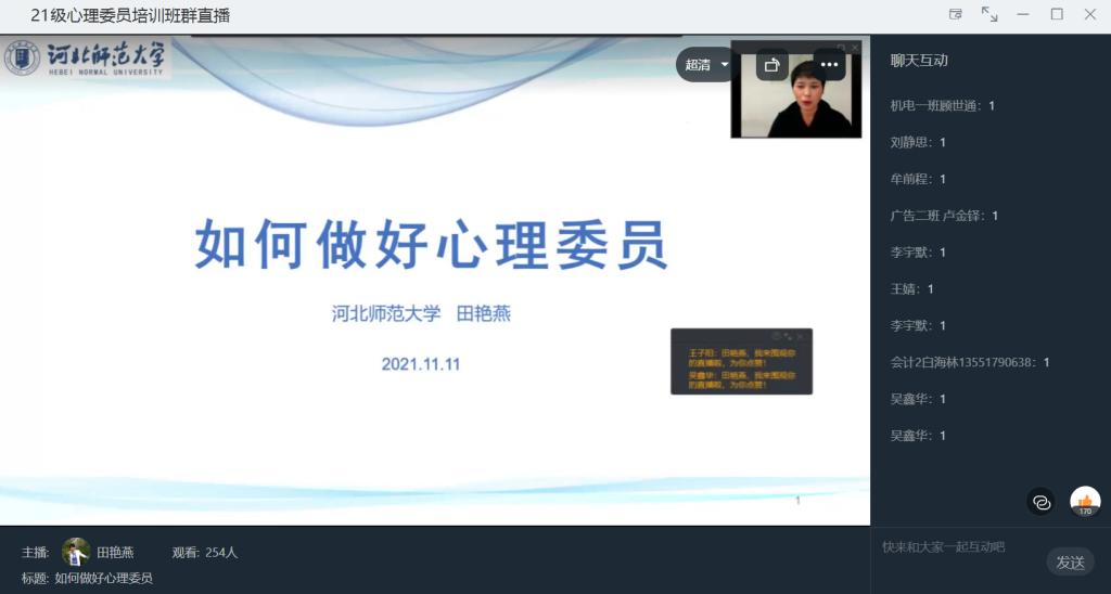 11月11日晚,2021年心理委员培训第二场讲座在钉钉平台线上开展。河北师范大学心理健康指导服务中心主任田艳燕老师为大家带来“如何做好心理委员”专题讲座,2021级各班心理委员、心晴社成员在线聆听。